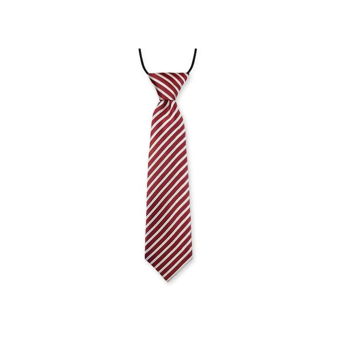 Bordeaux rode stropdas voor jongens met witte strepen. De kinderstropdas is gemaakt van eenvoudig te onderhouden microfiber met een satijnachtig glanzend oppervlak. Zeer geschikt voor speciale gelegenheden zoals een trouwerij, communie of kerst.
