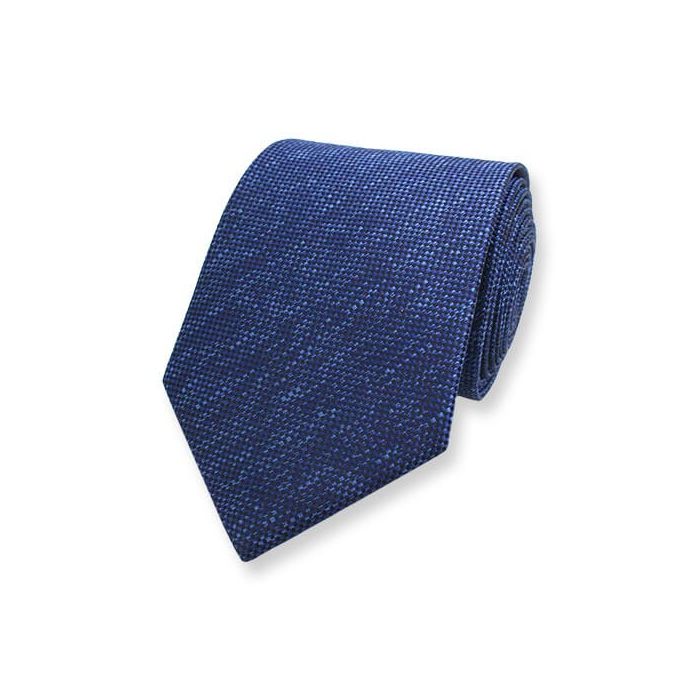 Donkerblauwe stropdas van hoge kwaliteit. Het materiaal doet denken aan denim/spijkerstof en heeft blauwe en lichtblauwe accenten. Deze stropdas heeft een breedte van 8 centimeter op het breedste punt.