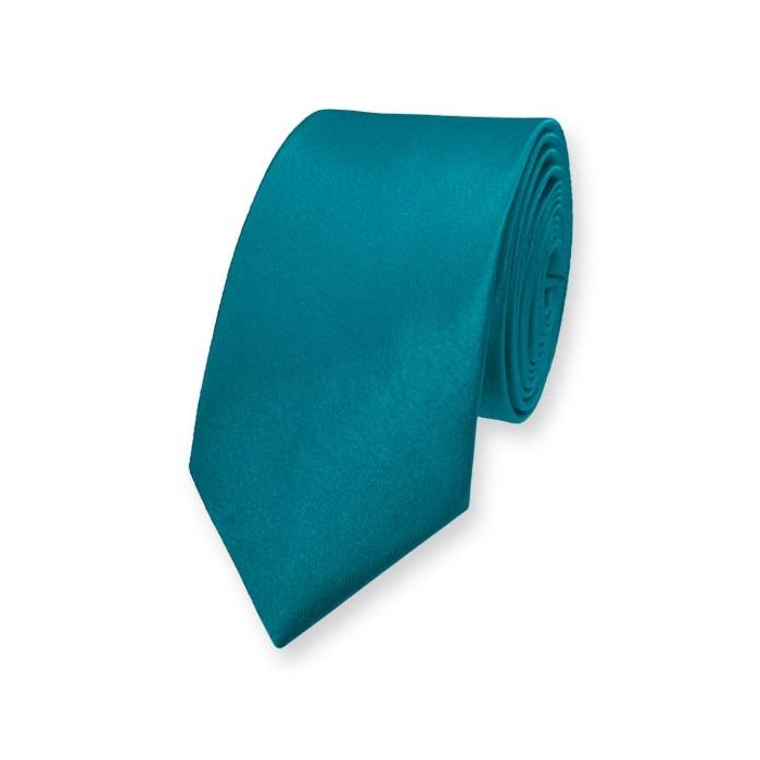 Stropdas in de kleur Teal, een prachtige combinatie van groen en blauw. Een diepe, gedempte kleur die vaak wordt gebruikt om het schitterende blauwgroen van tropische oceanen mee te beschrijven. Op het breedste punt is deze stropdas 5 centimeter breed.
