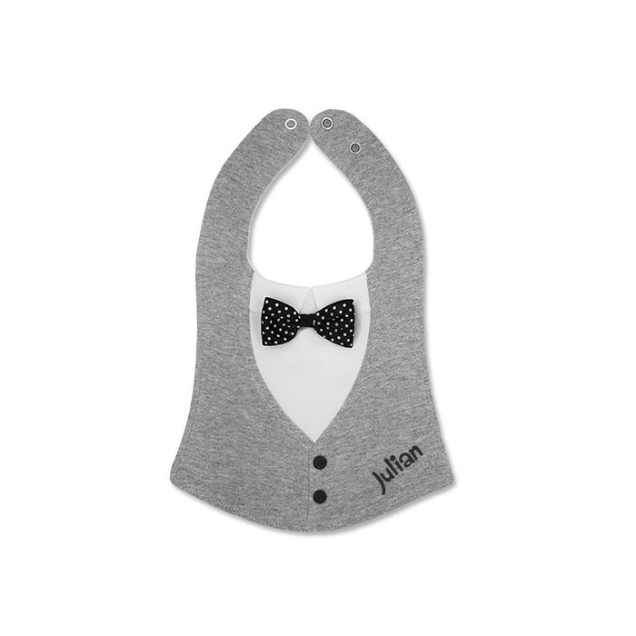 Laat uw baby in stijl eten met deze tuxedo slabber met naam. Deze leuke slabber met strik voor baby’s heeft de vorm van een gilet. Dankzij de verstelbare drukknoopjes in de hals is het slabbetje eenvoudig om en af te doen.