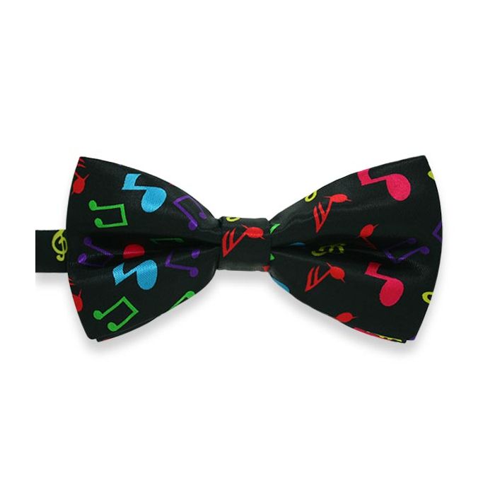 Zeer originele vlinderstrik met muzieknoten. Deze zwarte vlinderstrik wordt verfraaid door de kleurrijke muzieknoten. Deze noten hebben de kleuren: blauw, groen, roze, geel en rood. Deze voorgestrikte strik heeft een lichte satijnachtige glans en is eenvoudig om te doen door de verstelbare band. De vlinderdas is gemaakt van microfiber en is hierdoor duurzaam en behoeft weinig onderhoud.