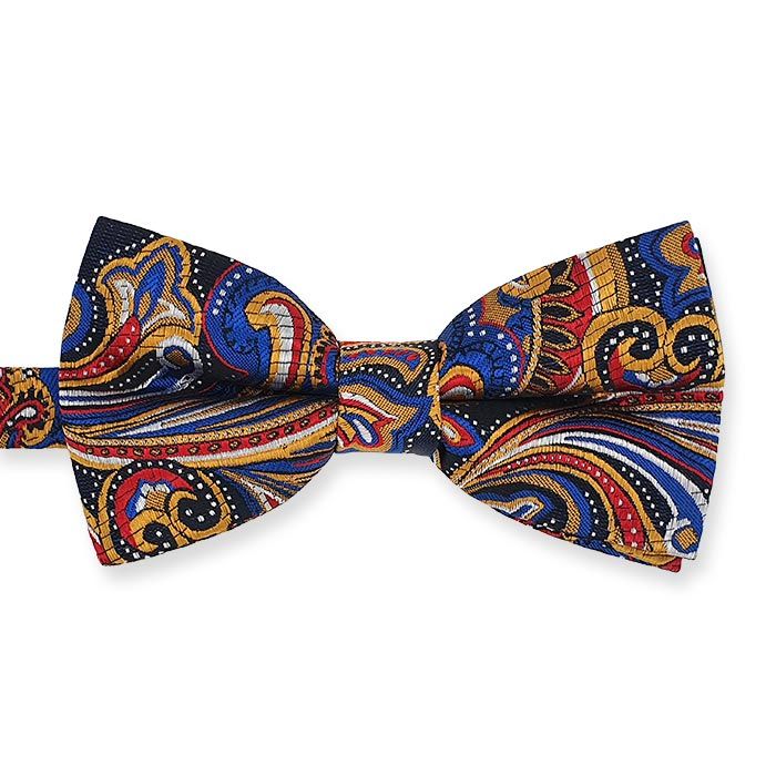 Deze stijlvolle vlinderdas heeft een paisley dessin in het blauw, rood en cognac. Het klassieke paisley patroon maakt uw outfit helemaal af. Deze voorgestrikte das heeft een lichte zijdeachtige glans en is eenvoudig om te doen door de verstelbare halsband.